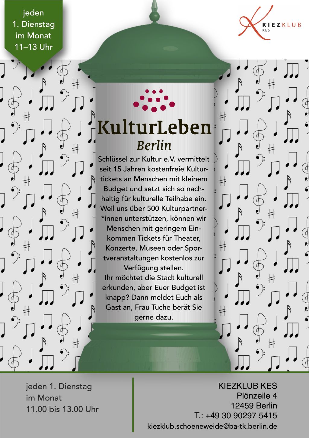 Ab April 2025 unterstützt der KIEZKLUB KES in Oberschöneweide KulturLeben Berlin als neue Anmeldestelle im Bezirk Treptow-Köpenick. Kulturbegeisterte mit kleinem Budget können sich erstmals am Dienstag, 1. April 2025, und dann an jedem ersten Dienstag im Monat von 11 – 13 Uhr am Info-Tisch von KulturLeben Berlin als Kulturgäste registrieren lassen.
